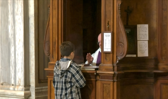 - Jóvenes, algunos muy jóvenes, esperan pacientemente recibir el sacramento de la reconciliación.