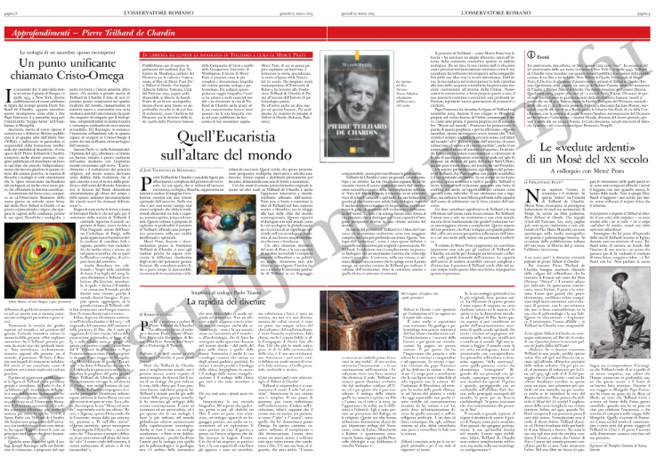 • “In libreria da lunedì la biografia di Teilhard a cura di Mercè Prats” (“En librerias desde el lunes la biografía de Teilhard escrita por Mercè Prats”).