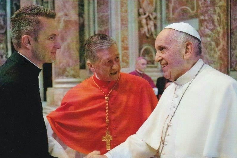 Condujo a Hicks enérgicamente hacia el Papa Francisco y le presentó en italiano, diciendo: «Santo Padre, éste es Ron Hicks, mi Vicario General, y habla español». Francisco se volvió hacia Hicks y empezó a hablar en español.
