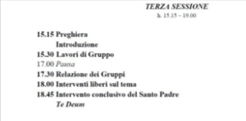 Sin embargo, resuylta que las intervenciones libres —que eran la parte central de los antiguos Consistorios— se reducen… a menos de 60 minutos en la Segunda Sesión , 45 minutos en la Tercera Sesión del segundo y último día (foto a la derecha), mientras que el resto (incluyendo todo el primer día, en la Primera Sesión ) se celebrará en las infames « mesas «, en pequeños grupos de trabajo de memoria bergogliana y sinodal.