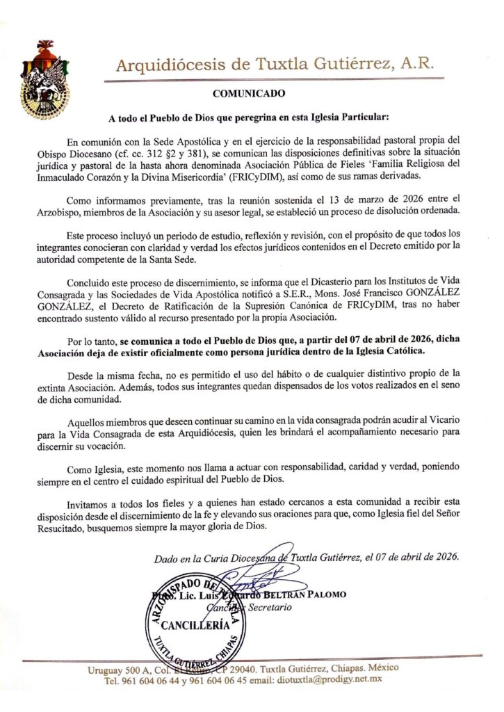 De la arquidiócesis de Tuxtla Gutiérrez por el que comunica la disolución de la Familia Religiosa del Inmaculado Corazón y Divina Misericordia, FRICyDIM