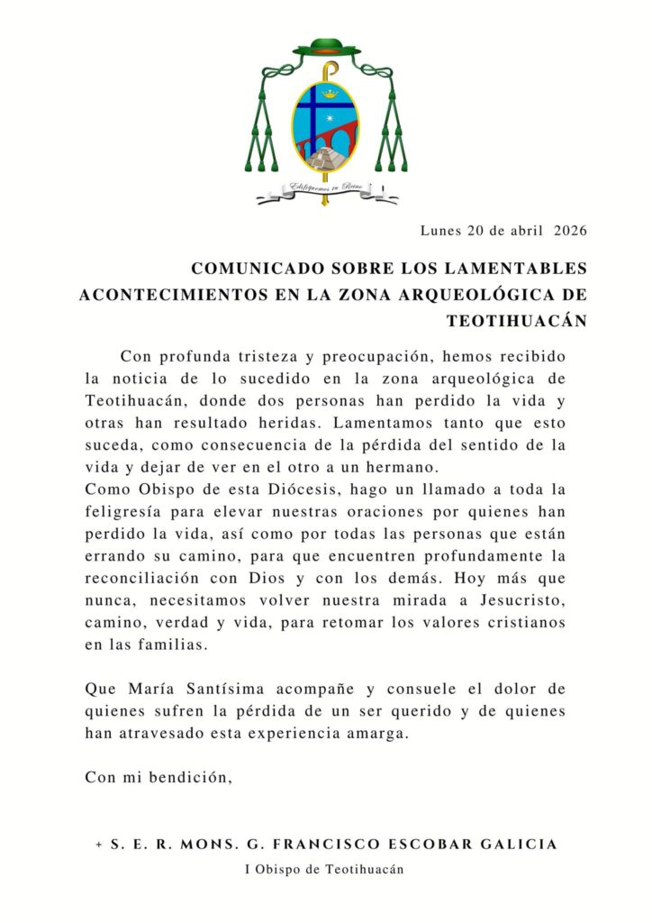 COMUNICADO De la diócesis de Teotihuacán sobre los lamentables acontecimientos en la zona arqueológica Guillermo Gazanini Espinoza Published: abril 20, 2026 No hay comentarios Deja una respuesta Cancelar la respuestaTu dirección de correo electrónico no será publicada. Los campos obligatorios están marcados con *Comentario * Nombre * Correo electrónico * Web Guarda mi nombre, correo electrónico y web en este navegador para la próxima vez que comente. ¡Suscríbete! Suscríbete para estar al tanto de lo que acontece en la Iglesia Católica en México y el mundo. Correo electrónico: Deja vacío este campo si eres humano: Síguenos en Facebook Síguenos en YouTube - ¡ANÚNCIATE! -