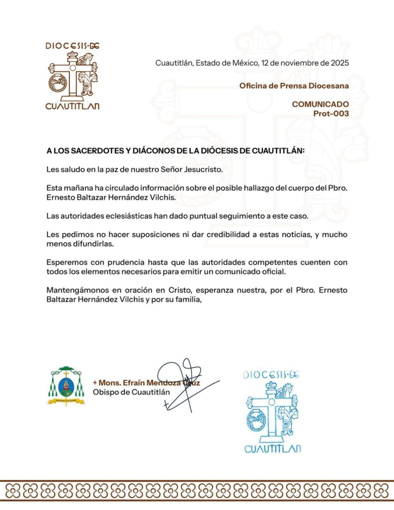 Del obispo de Cuautitlán, Efraín Mendoza Cruz, relativo al hallazgo de un cuerpo que podría vincularse con el del sacerdote desaparecido Ernesto Baltazar Hernández Vilchis