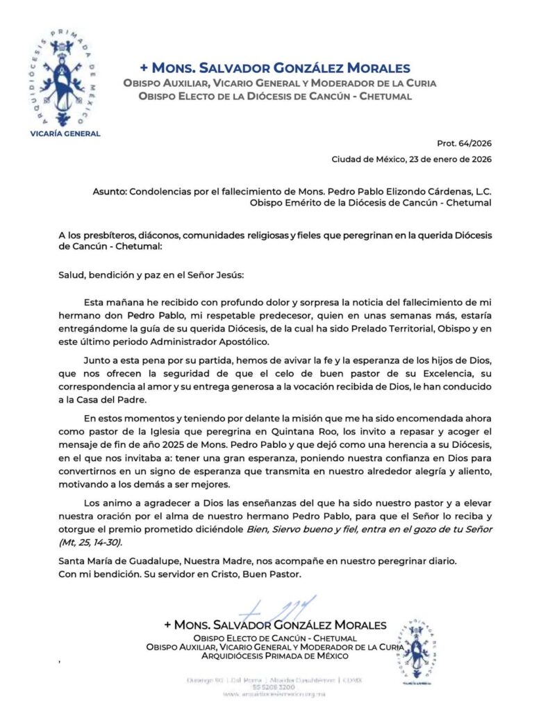 Del obispo electo de Cancún-Chetumal, Salvador González Morales, por el que expresa sus condolencias por el fallecimiento del obispo emérito Pedro Pablo Elizondo Cárdenas