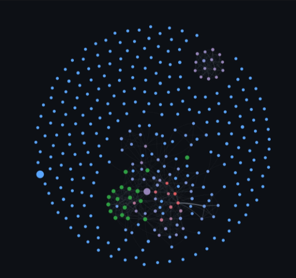 Los sitios de la darknet se representan como galaxias. Donde existen conexiones, aparecen cúmulos (mostrados en verde, rojo y morado). (Imagen: Complexity Science Hub)