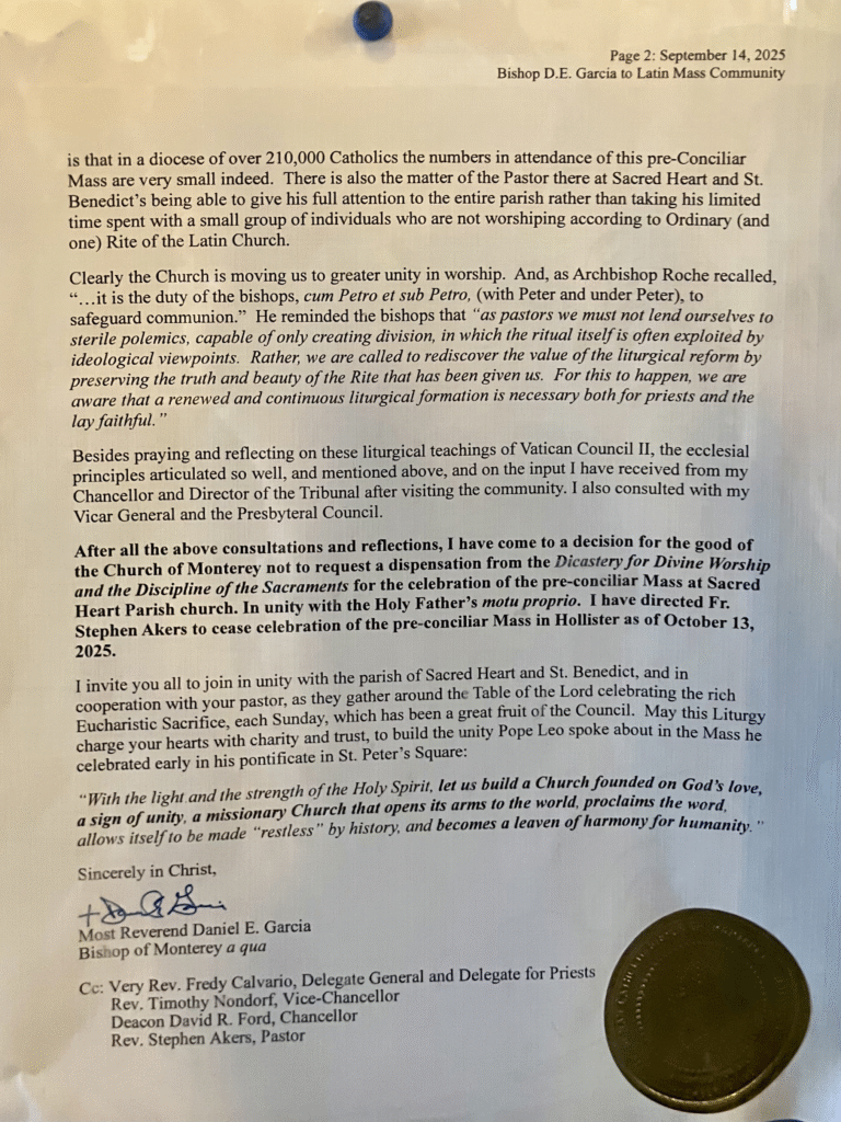 El obispo Daniel García, de 65 años, puso fin a la misa de rito romano de 17 años en Hollister en una carta fechada el 14 de septiembre.