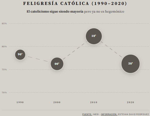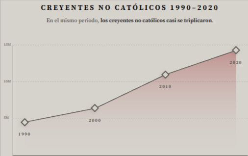 En 1990, 79% de la población se declaraba católica. En 2020, la cifra bajó a 77%. Puede parecer una caída marginal, pero en un país de más de 126 millones de habitantes, representa millones de personas.