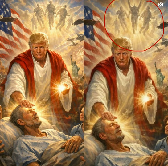 Nick Adams publicó por primera vez la imagen de Donald Trump como una especie de mesías en febrero. Adams escribió: «Trump está curando a esta nación». Sin embargo, Trump volvió a publicar hoy una versión alterada de la imagen. Añadió un demonio con cuernos a la ya perturbadora imagen.(De Profundis)