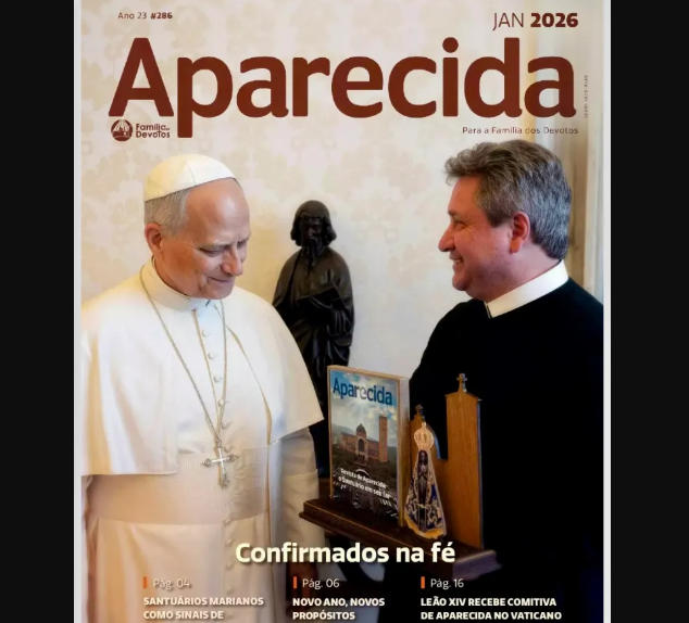 El Papa León ya ha demostrado en varias ocasiones cuánto disfruta aparentar que no pasa nada durante los momentos más complejos de su ministerio petrino. Y aquí está de nuevo, sonriendo en la portada del número de enero de 2026 de la Revista de Aparecida junto al rector del Santuario Mariano, el redentorista Eduardo Catalfo: la foto muestra la audiencia especial que Prevost reservó a una delegación que llegaba al Vaticano desde el Santuario de Nuestra Señora de Aparecida, en el estado de São Paulo, Brasil.