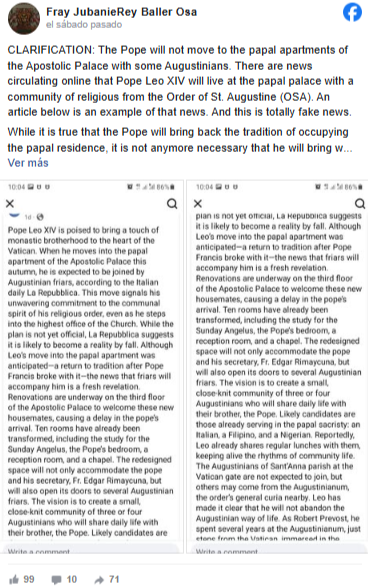 En su perfil de Facebook ha destacado que «mientras es cierto que el Papa Prevost volverá a la tradición de ocupar la residencia papal, ya no es necesario que lleve consigo a algunos de sus hermanos en la orden agustina ya que frecuentemente los visita en su convento cerca del palacio papal.