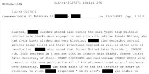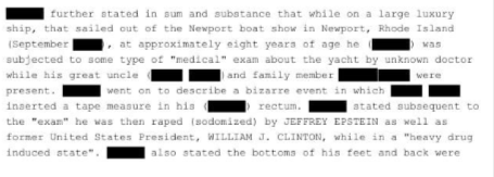 Según el interlocutor del agente del FBI, cuando tenía aproximadamente ocho años, se sometió a un «examen médico» en un yate, tras el cual presuntamente fue violado por «Epstein y el expresidente estadounidense Bill Clinton». También mencionó infanticidio y canibalismo.