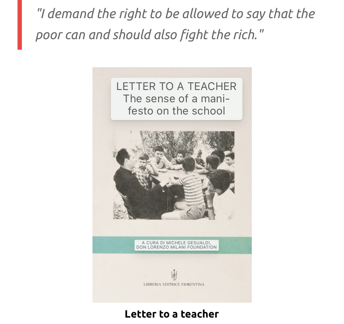 El experimento educativo de Milani en Barbiana desdibujó toda línea moral entre profesor y alumno. Se convirtió en el semillero de Il Forteto, la comuna toscana cuyo fundador, Rodolfo Fiesoli, se jactaba de estar haciendo realidad la visión de Milani «mejor y más grande».