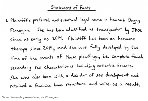 La mayor parte de la denuncia de Finnegan giraba en torno a varios casos de presunto abuso sufrido por ser una «mujer trans en un centro de detención para hombres». Finnegan alegó que «ser obligado a dejarse crecer la barba» le provocó «intensos pensamientos de autocastración y suicidio». También afirmó que tenía «la necesidad de ser trasladado a una prisión de mujeres, de que el IDOC usara su nombre femenino, de someterse a cirugía de afirmación de género y de depilación facial».