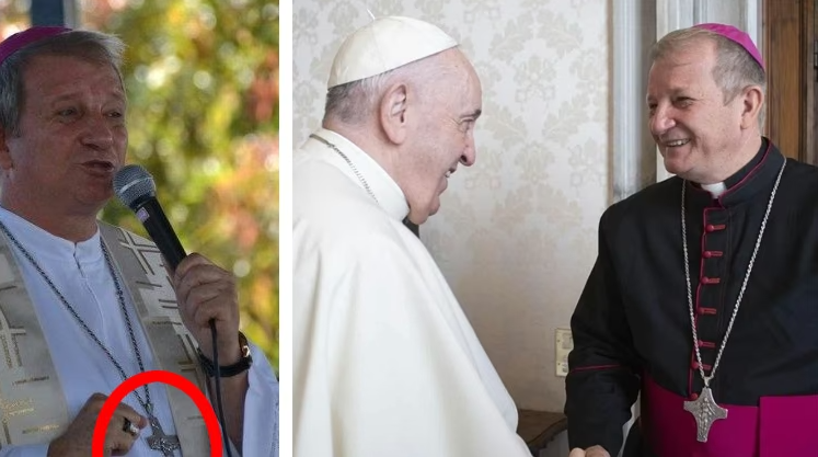 El obispo da Silva también utiliza la extraña cruz de Francisco con el supuesto símbolo del Buen Pastor con los brazos cruzados. Se remonta al cardenal pro-homosexual Louis Bernardin (1928-1996) de Chicago.