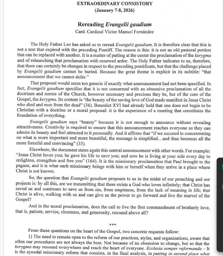Fernández comienza con una orden: releer la Evangelii gaudium, como si la relevancia de un documento se creara por decreto papal y no por fidelidad a lo que Cristo transmitió. Insiste en que «no ha caducado» y luego revela por qué.