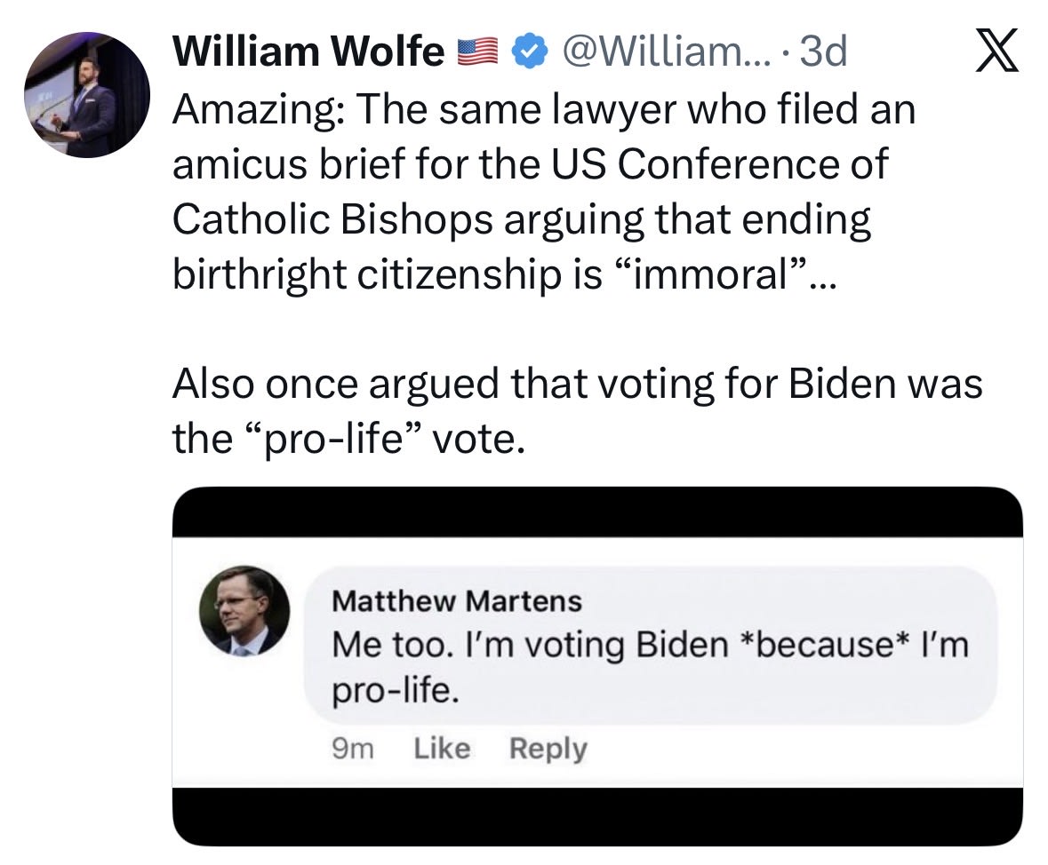Y esto ocurre justo cuando los obispos estadounidenses presentan un escrito amicus curiae insistiendo en que eliminar la ciudadanía por nacimiento es «inmoral» y «antitético a las enseñanzas de la Iglesia», mientras tratan un determinado acuerdo constitucional estadounidense como si fuera un absoluto moral. El mismo reflejo está en todas partes: inflar la «dignidad» hasta convertirla en una llave maestra, y luego usarla para abrir cualquier puerta política que el momento exija.