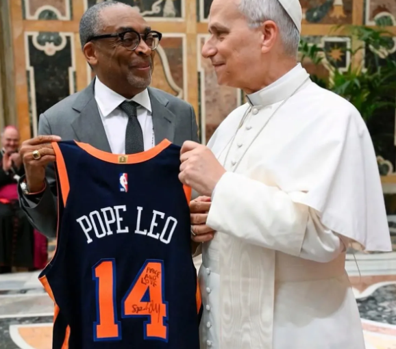 - Spike Lee le entrega una camiseta de los Knicks con el número “Leo 14” en la espalda,