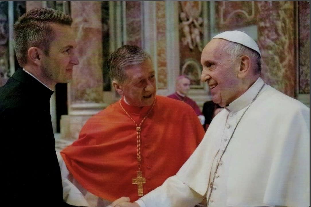 Y sí, la diócesis de Joliet publicó la historia del origen de Hicks como si fuera una estampa: Cupich, en San Pedro, ve a Francisco y toma a Hicks del brazo con una sonrisa: