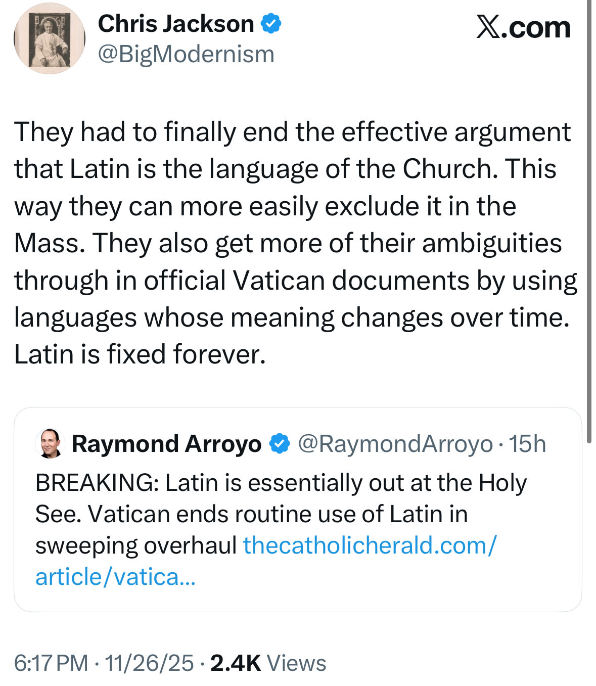 Cualquier otra lengua que no sea el latín se usa solo en ciertos ritos orientales, en comunidades que nunca estuvieron en estrecho contacto con Roma y que han usado el griego, el siríaco o el árabe desde el principio de su historia. Incluso en estas, el idioma empleado en el culto divino no es el idioma hablado actual, sino una forma más antigua, tan ininteligible para los fieles como lo es el latín para el laico promedio de nuestras parroquias.