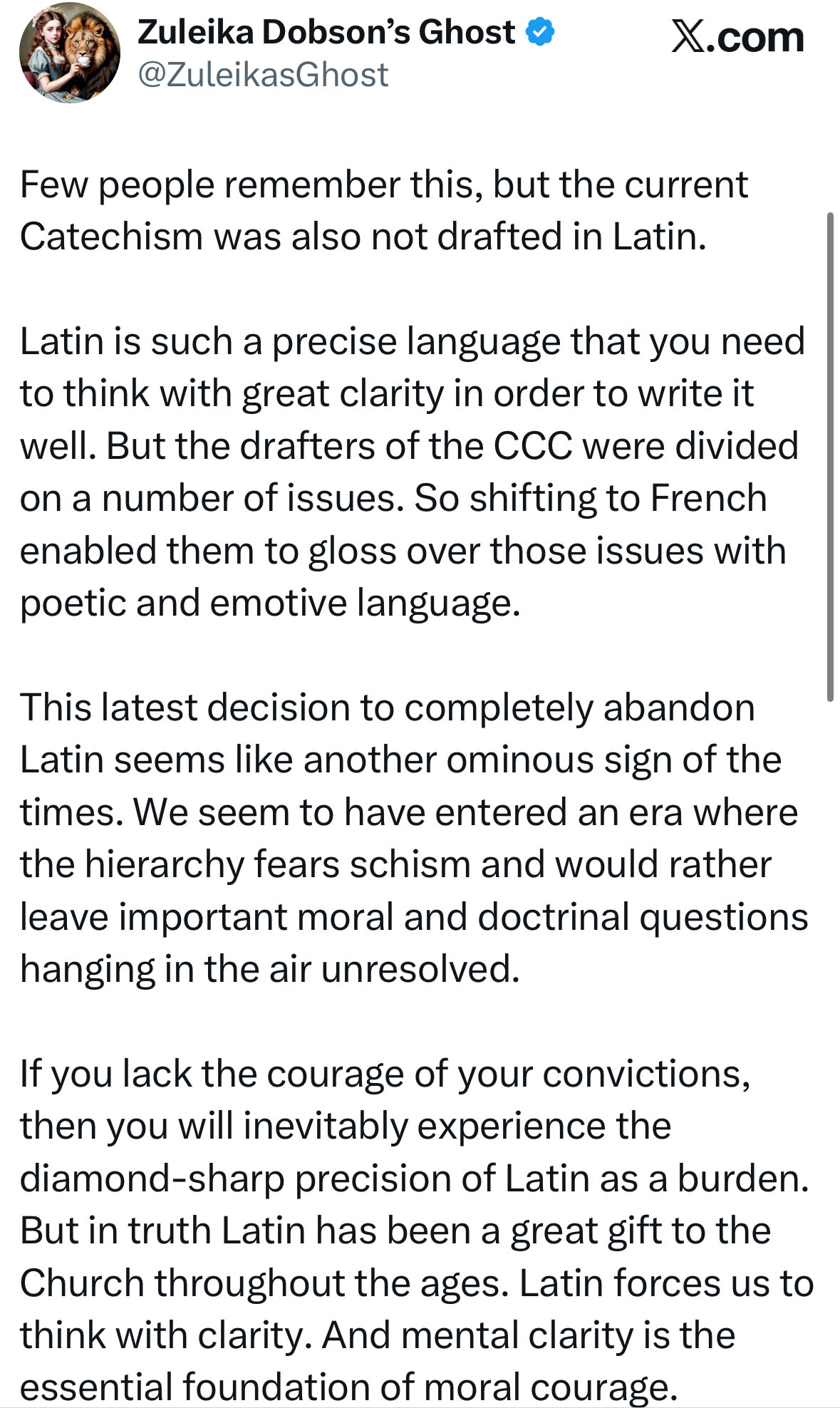 La tradición católica nunca elogió el latín solo por su belleza o antigüedad.