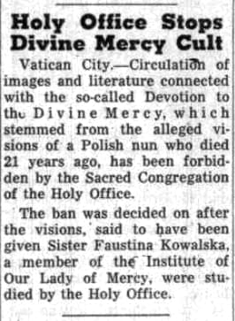 - La notificación del 6 de marzo de 1959, publicada en las Acta Apostolicae Sedis, declaraba que se prohibía la distribución de imágenes y escritos que presentaran la devoción a la Divina Misericordia «en las formas propuestas por esta Hermana Faustina», y dejaba a los obispos la libertad de retirar dichas imágenes ya expuestas para el culto.