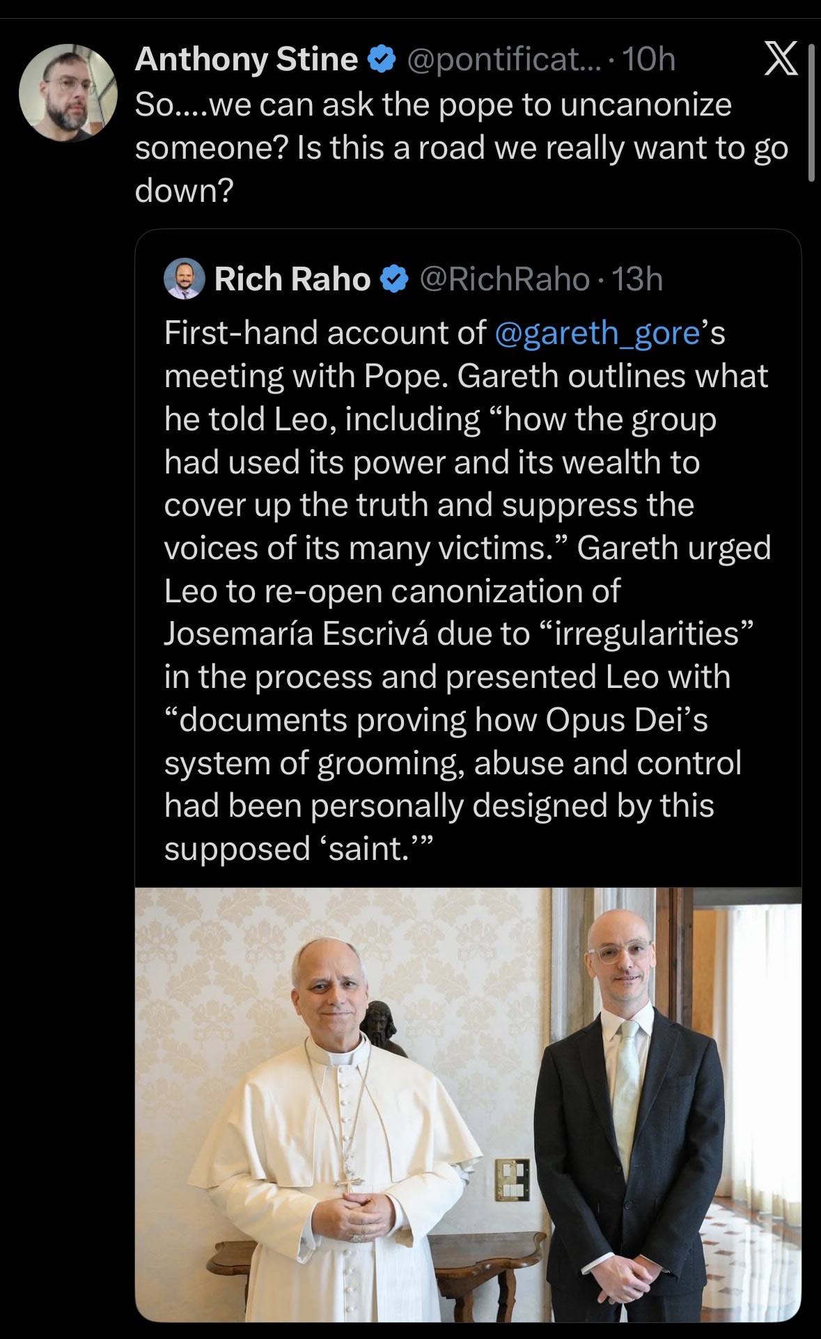La reacción en línea dejó claro rápidamente por qué esto es tan polémico: para muchos, suena como pedirle a Leo que «descatalogue» a alguien. Una publicación de Rich Raho, que se compartió ampliamente, resumió la afirmación de Gore de que instó a reabrir el proceso de canonización debido a «irregularidades».