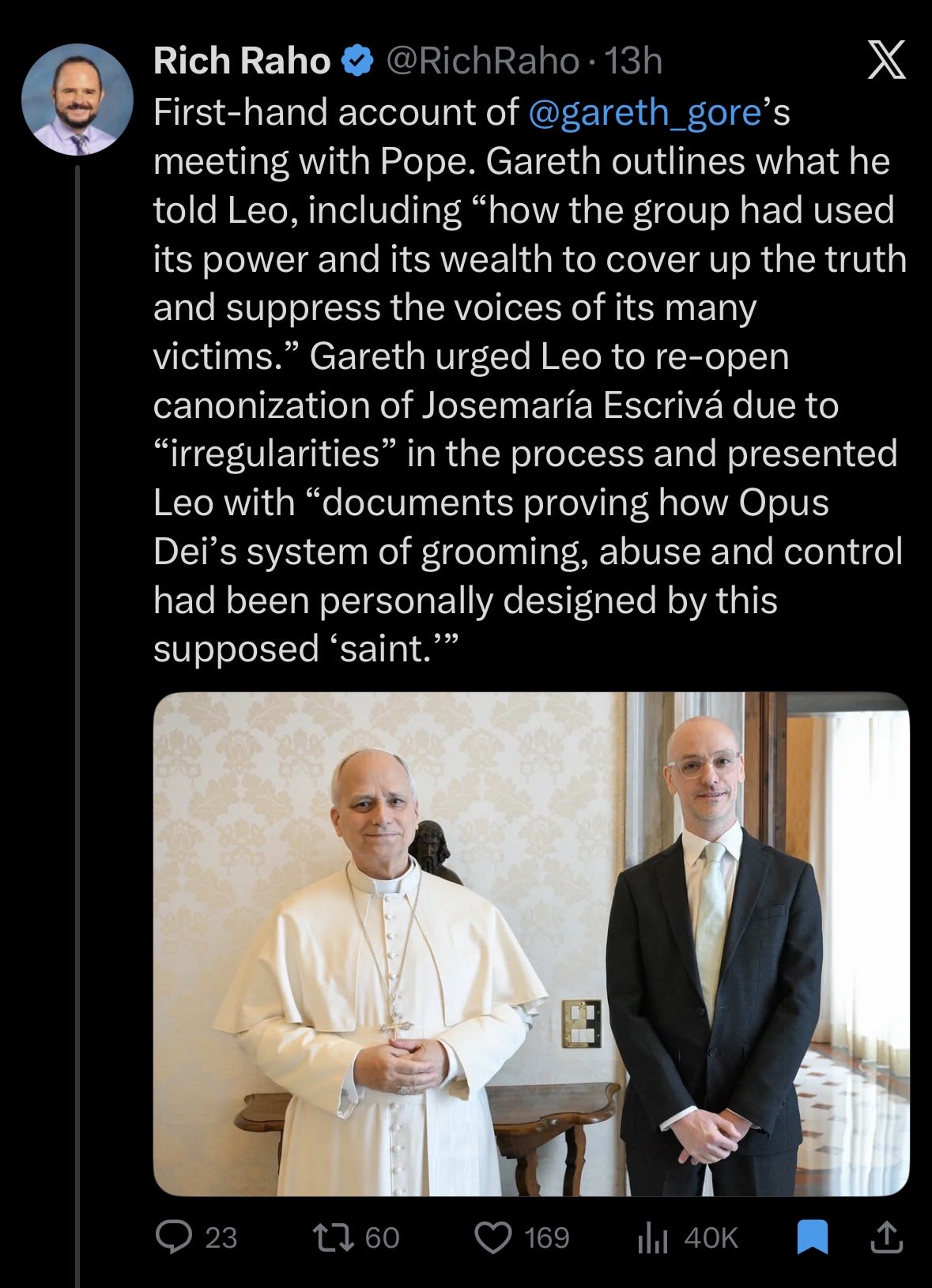 El 16 de marzo de 2026, León XIV se reunió en privado con Gareth Gore, un periodista británico que ha escrito artículos críticos sobre el Opus Dei. Según Reuters, el Vaticano declaró que León XIV quería escuchar de primera mano las acusaciones de Gore y que una reunión privada de este tipo con un periodista es inusual.
