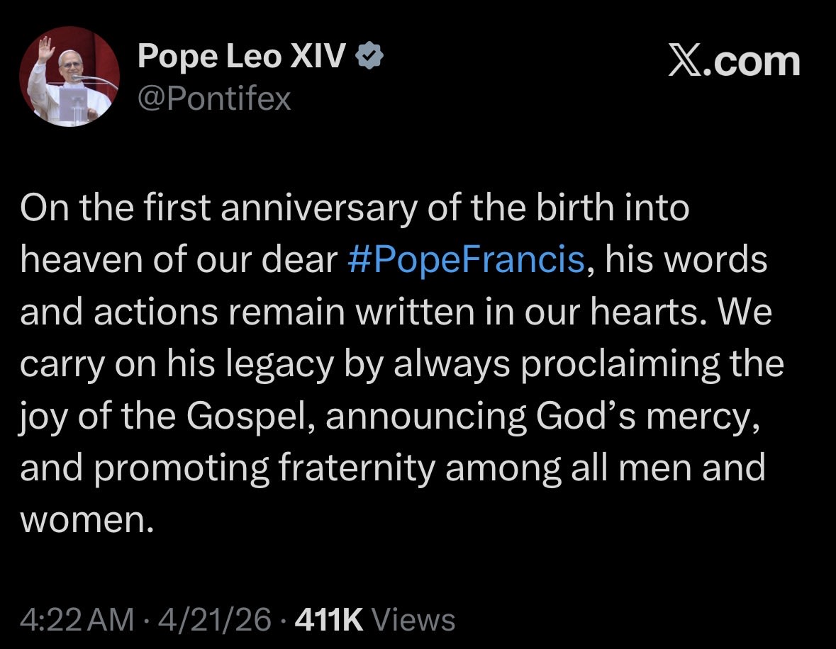 Y Ahora tenemos el tuit del aniversario, por tercera vez, y va aún más allá. Leo no solo sitúa a Francisco en el Cielo, sino que utiliza esa suposición para sacralizar su legado.