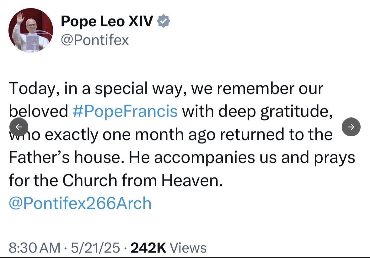 - Luego llegó el mensaje del 21 de mayo de 2025, donde León XIII afirmó que Francisco había «regresado a la casa del Padre» y añadió que «nos acompaña y ora por la Iglesia desde el Cielo».