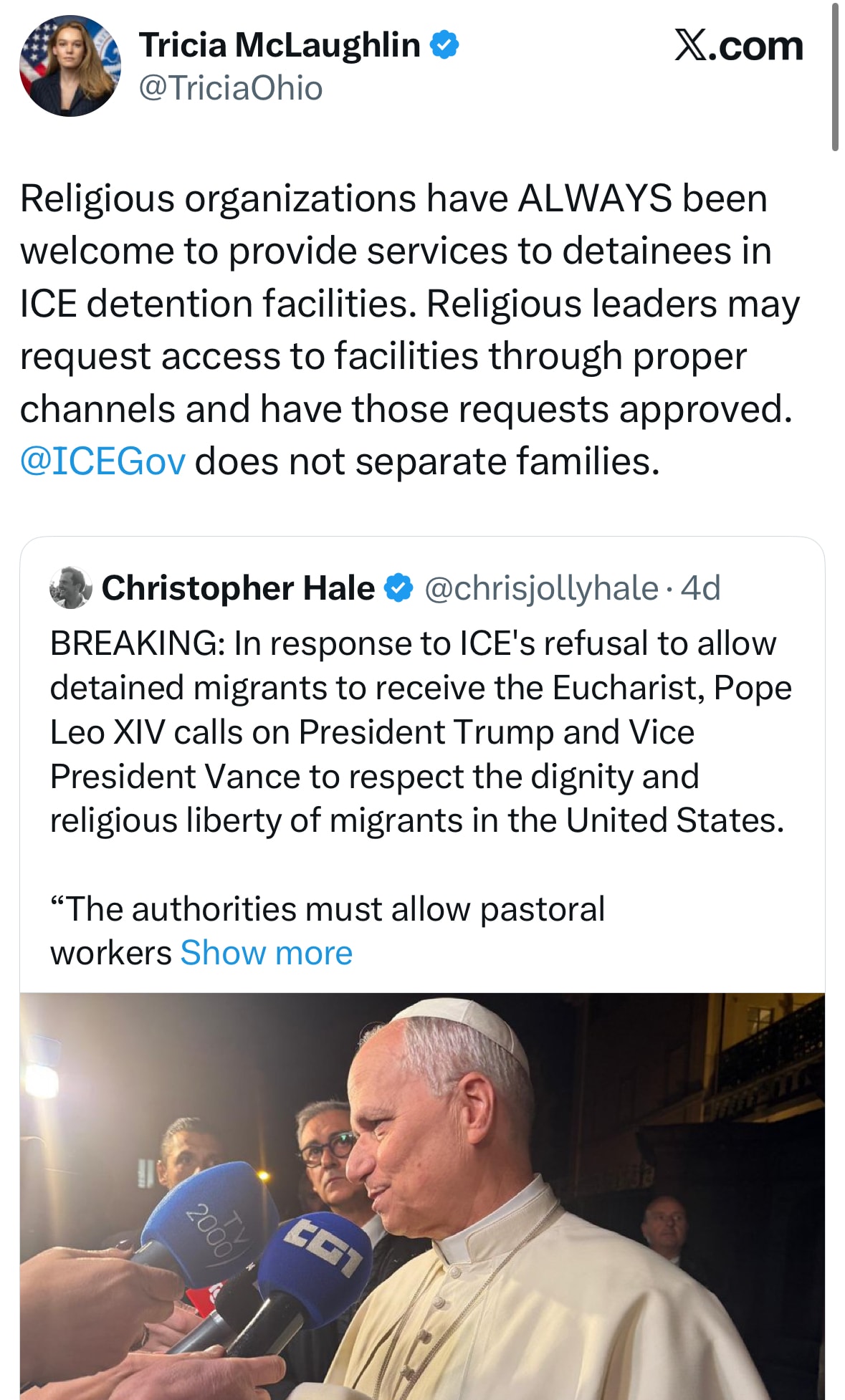 Incluso su sesión de fotos con la política del ICE, pidiendo que los migrantes detenidos recibieran la Eucaristía, fue un ejemplo perfecto de imagen pública: indignarse, generar titulares y dejar que un funcionario estadounidense (en este caso Tricia McLaughlin) corrija la situación en menos de una hora.