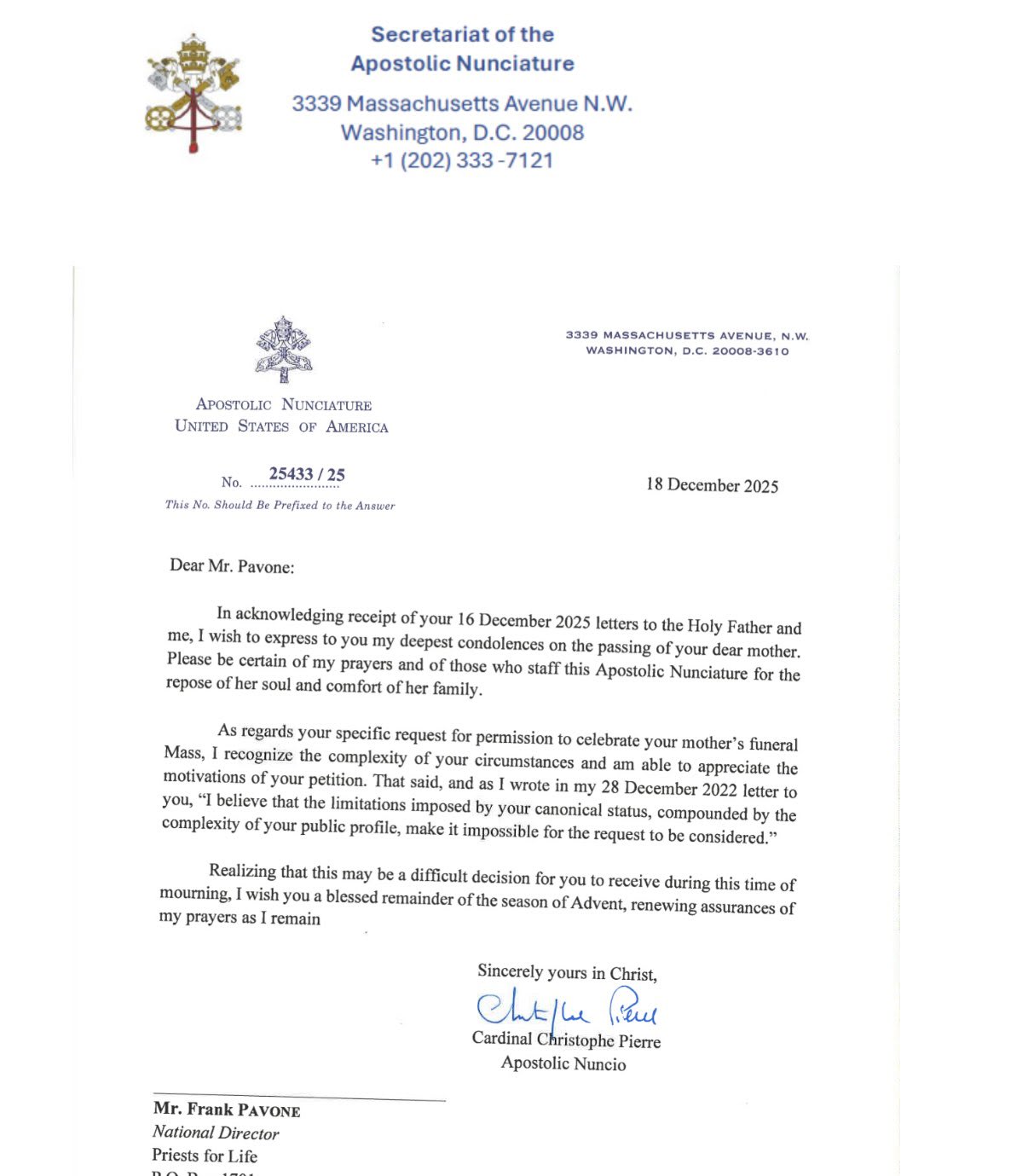 El padre Frank Pavone publica una nota con membrete del nuncio.