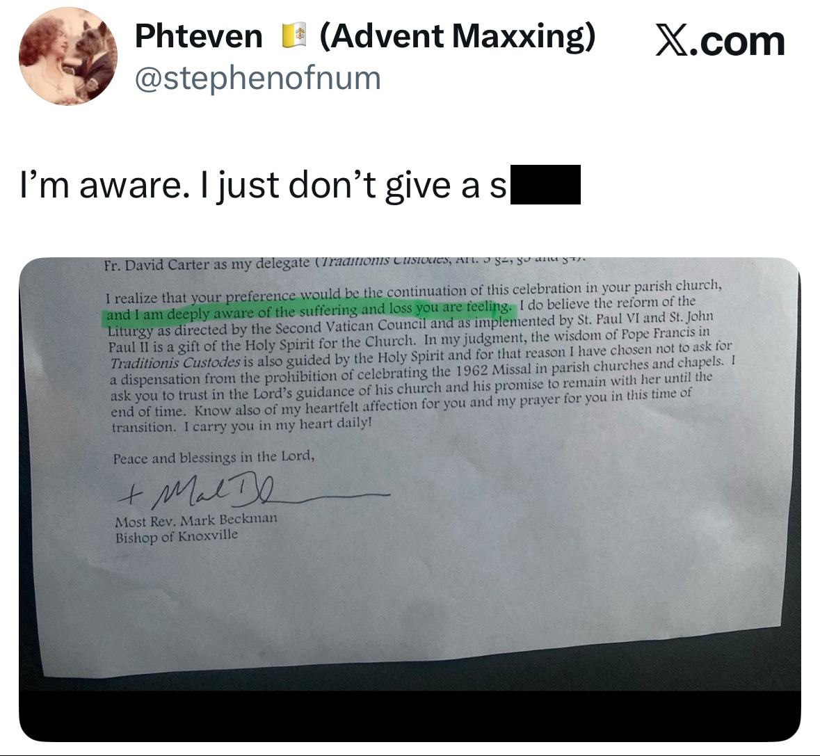 Cita la Traditionis Custodes como «guiada por el Espíritu Santo». Reitera que la reforma de la liturgia, dirigida por los padres conciliares e implementada por Pablo VI y Juan Pablo II, es un «don del Espíritu Santo». Afirma explícitamente que ha optado por no solicitar a Roma una dispensa para permitir la misa tradicional en las iglesias parroquiales.