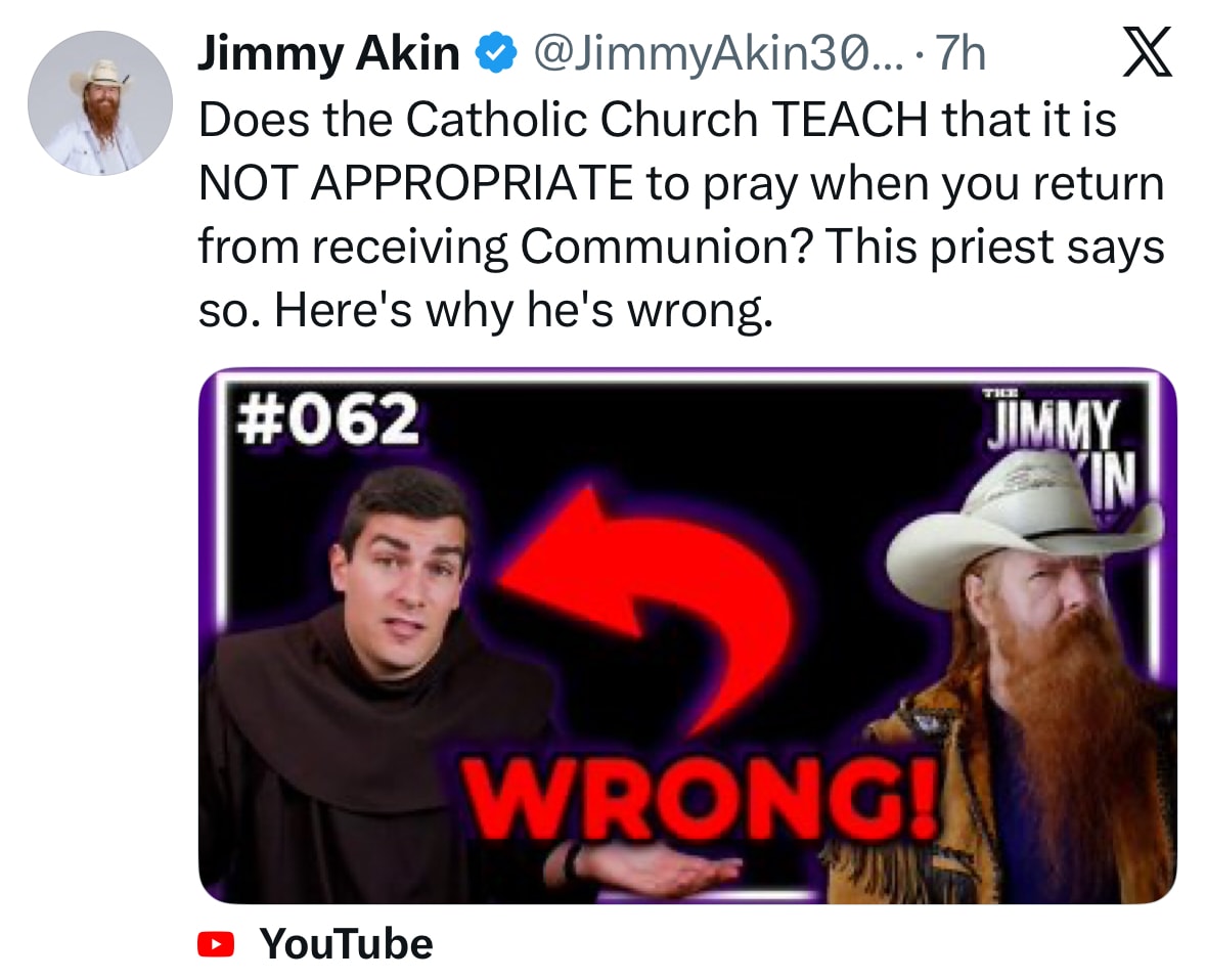 En su último video promocional, pregunta si la Iglesia enseña que no es apropiado rezar después de la Comunión, porque un sacerdote supuestamente desaconsejó la oración privada al regresar a la iglesia. Jimmy planea explicar por qué se equivoca.
