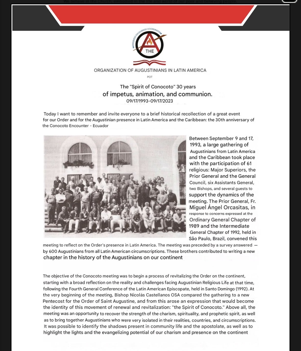• Dicho documento describe la reunión de 1993 como marcada por la «sinodalidad agustiniana» y afirma que el «Espíritu de Conocoto» fue un espíritu de reflexión, conversión, reconciliación, profecía, comunión y participación.