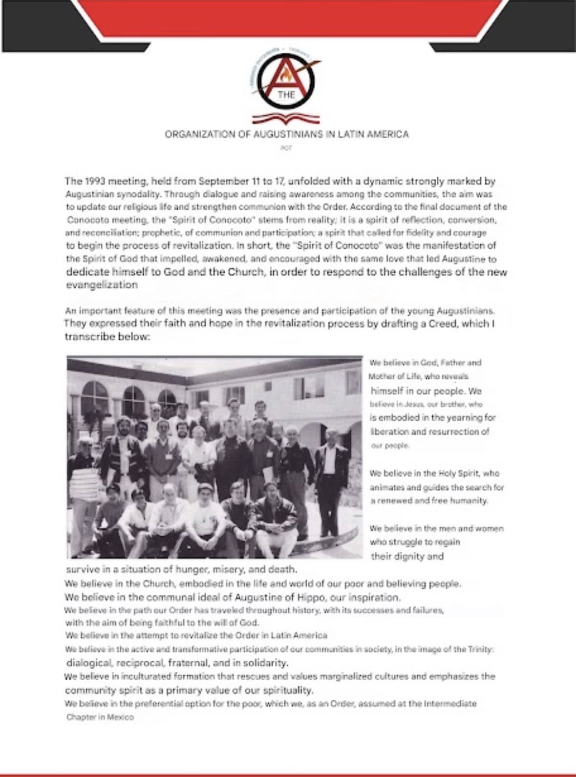 • Dicho documento describe la reunión de 1993 como marcada por la «sinodalidad agustiniana» y afirma que el «Espíritu de Conocoto» fue un espíritu de reflexión, conversión, reconciliación, profecía, comunión y participación.