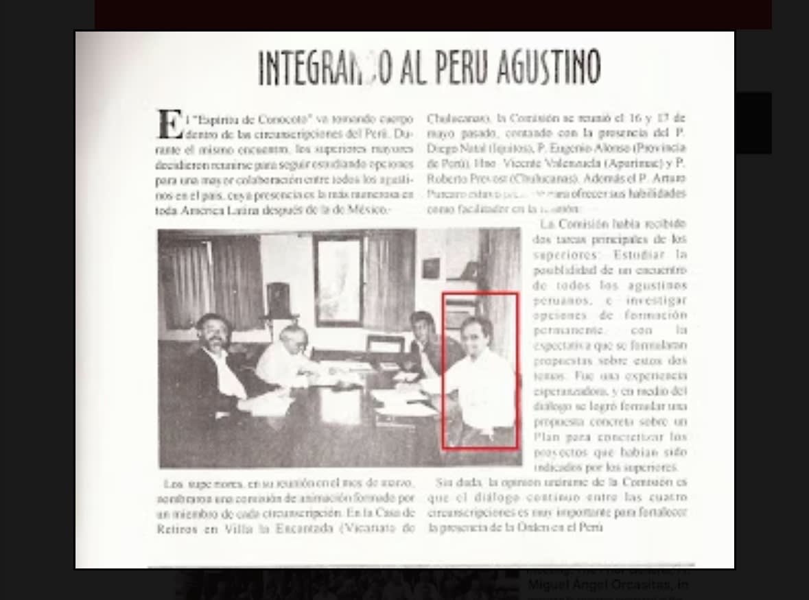 • El recorte de «Integrando al Perú Agustino» habla de la entrada del «Espíritu de Conocoto» en Perú, y el nombre resaltado identifica a Prevost de Chulucanas dentro de ese entorno.