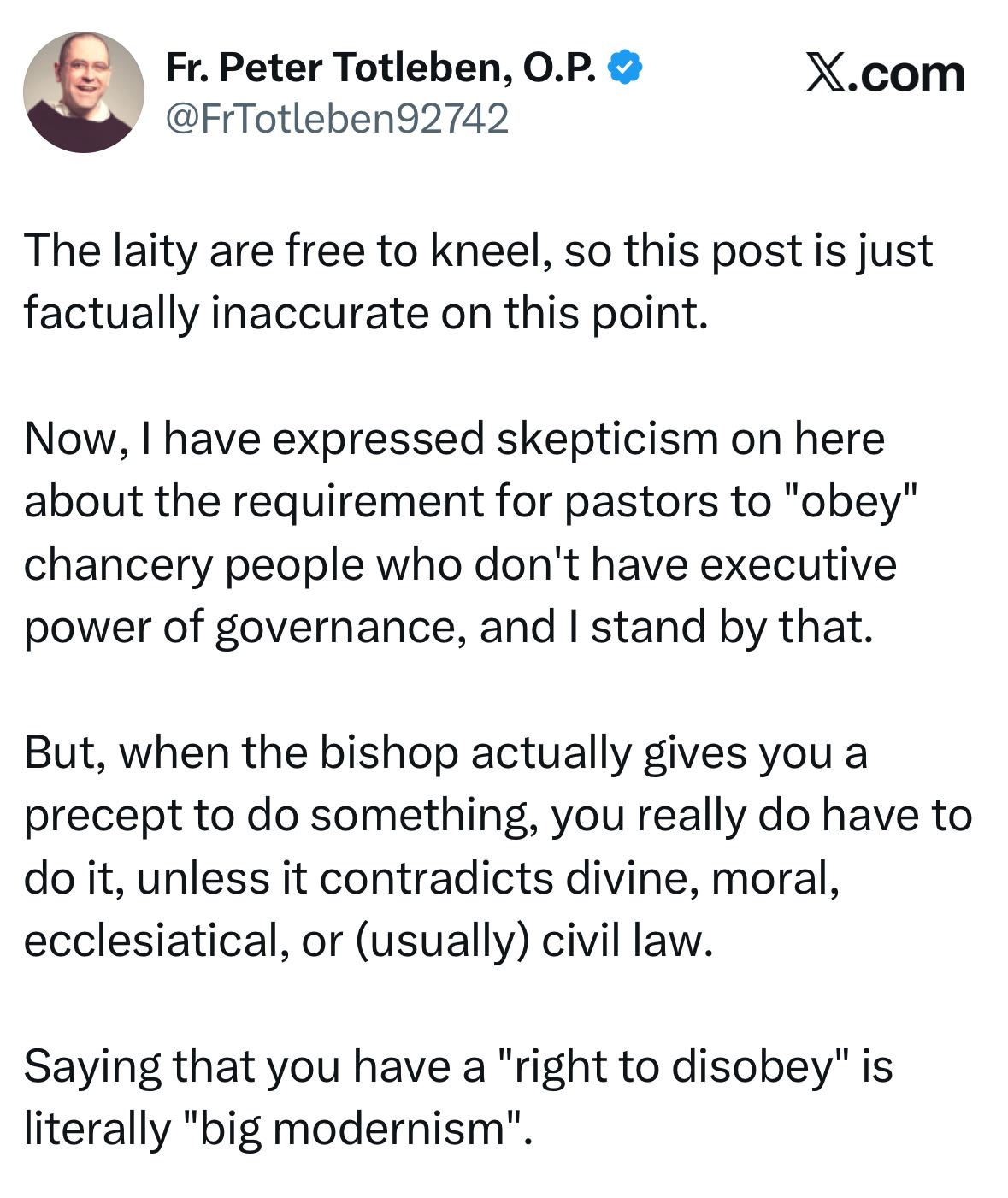 Esta es la ironía que Totleben no ve. Me acusa de «modernismo» por defender el derecho de los fieles a arrodillarse, al tiempo que plantea la afirmación más modernista imaginable: que la autoridad define la verdad en lugar de servirla. Eso es, literalmente, modernismo: la idea de que lo que decreta la jerarquía se convierte en la medida de la ortodoxia, independientemente de lo que la fe haya sostenido siempre.