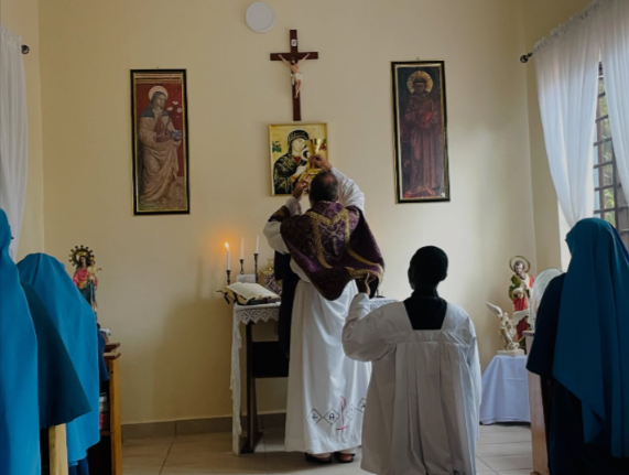 Misa celebrada en el convento franciscano para las hermanas franciscanas. En la tranquilidad de su hogar conventual, el Santo Sacrificio de la Misa sigue siendo el centro de sus vidas, alimentando su vocación de oración, sacrificio y servicio amoroso a Dios y a su Iglesia.