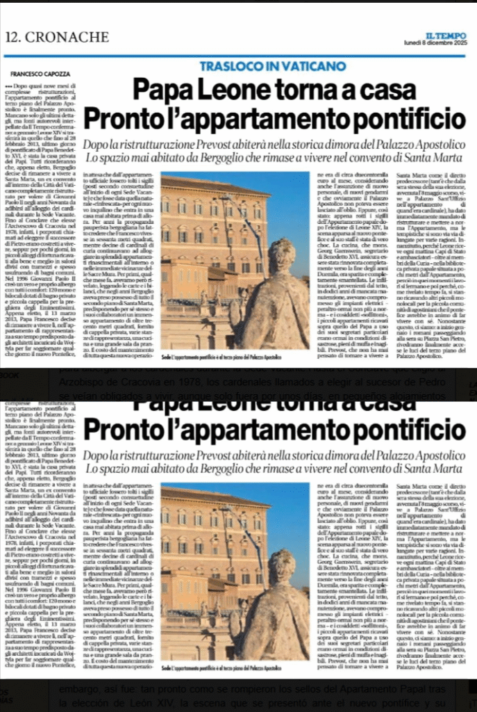 Solo faltan los últimos detalles, pero fuentes fidedignas consultadas por Il Tempo confirman que en enero, León XIV se mudará a la que fue la residencia privada de los Papas hasta el 28 de febrero de 2013, último día del pontificado de Benedicto XVI.