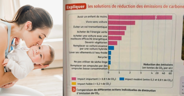 Libro de texto de «ciencias de la vida» y la tierra publicado por Nathan, un gráfico dedicado a las «soluciones para reducir las emisiones de carbono» sitúa «tener un hijo menos» en primer lugar, muy por delante de todas las demás acciones individuales.