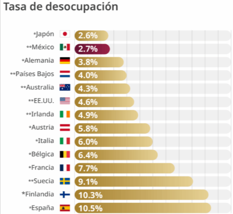 La presidenta de México, Claudia Sheinbaum Pardo, festejó este viernes que el país está por cerrar el año como el segundo con menos desempleo en el mundo, con una tasa de desempleo del 2.7%, tan solo detrás de Japón, con el 2.6%.