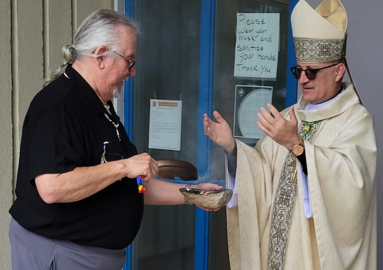 El mismo informe diocesano afirma que, junto al pan y el vino, se presentaron ofrendas simbólicas indígenas, como una canoa, tabaco, una pluma, una camisa naranja y una copa con una rueda medicinal.