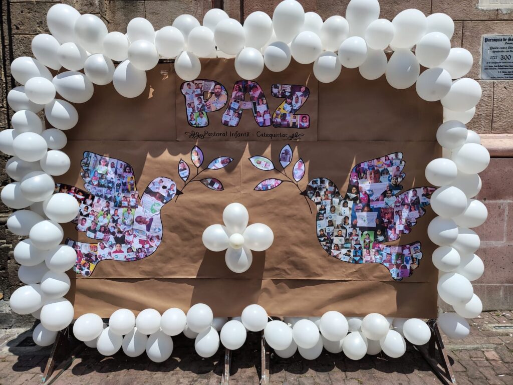 Las catequistas instalaron un periódico mural con imágenes de los niños del catecismo orando por la paz, además de un video en el que los pequeños expresan, con sencillez y fuerza, su petición por un mundo sin miedo. La presencia de los niños nos recuerda que la paz no es solo un tema público, es una tarea espiritual y cotidiana que se aprende desde el hogar.