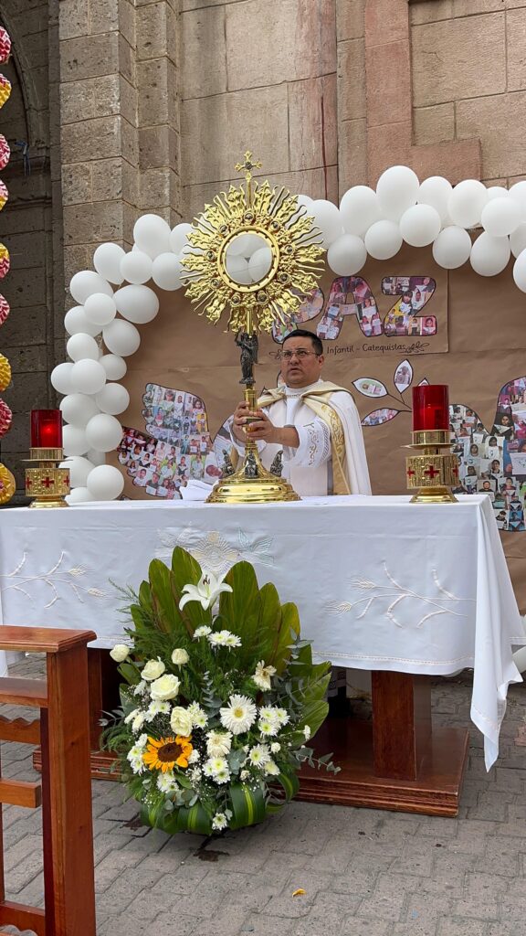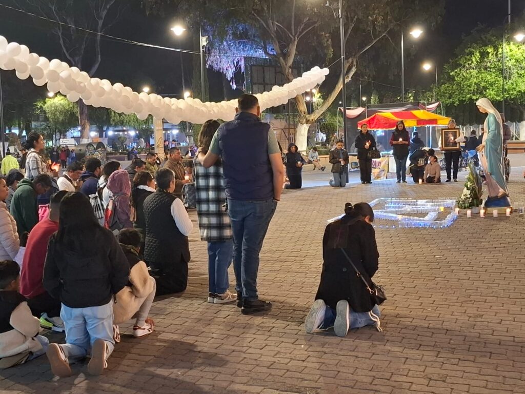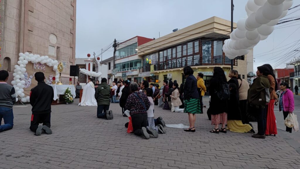 La jornada inició a las 12:00 horas con el repique de campanas en la parroquia y sus capillas, gesto que convocó a la comunidad a levantar el corazón en súplica. En el atrio parroquial se rezó el Santo Rosario, colocando en el centro la intención de la paz como un clamor común: paz en los territorios heridos por la violencia, paz en las familias, paz en los corazones.
