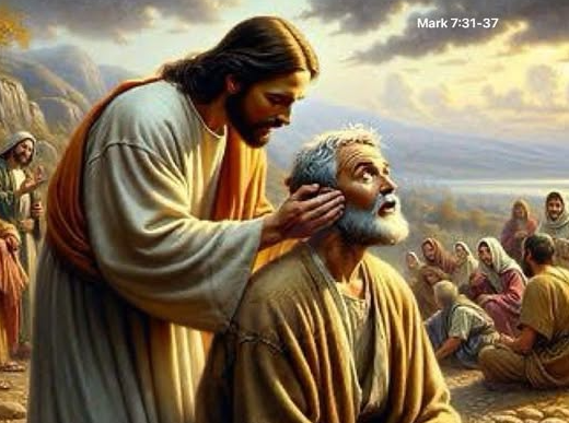 Le traen a uno que era sordo y que a duras penas podía hablar y le ruegan que le imponga la mano. Y apartándolo de la muchedumbre, le metió los dedos en las orejas y le tocó con saliva la lengua; y mirando al cielo, suspiró, y le dijo: