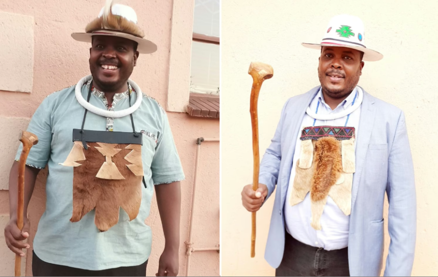 En el entorno cultural sotho-tsuana, este atuendo ceremonial, como las pecheras de piel de animal y el bastón de madera, simboliza la hombría adulta, la dignidad, el liderazgo y el orgullo por el linaje ancestral.