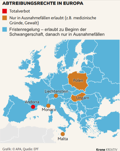 En la mayoría de los países, el aborto está permitido al inicio del embarazo, pero solo en circunstancias excepcionales posteriormente. En Polonia, Hungría, Liechtenstein, Mónaco y Malta, el aborto solo está permitido en casos excepcionales. Andorra lo prohíbe totalmente. Fuente: EPF.