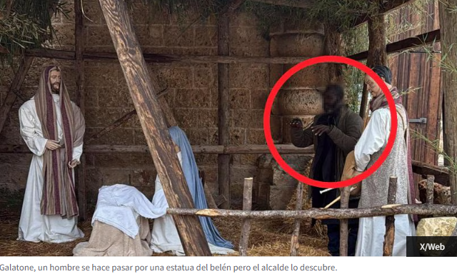 La estatua, un hombre de 38 años, fue captada con cámaras de celulares por los presentes, de pie entre las estatuas de tamaño natural de los pastores y la Sagrada Familia.