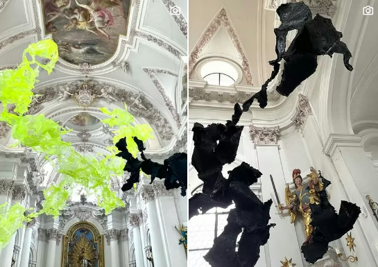 Durante la Cuaresma, el escultor ucraniano Olexiy Potupin presenta esculturas orgánicas suspendidas en amarillo fluorescente y negro en la Iglesia Universitaria de San Johannes de Innsbruck, Austria.