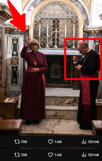 Tanto es así que, durante su visita a la Basílica de San Pedro el domingo, un funcionario del Vaticano (el arzobispo Flavio Pace, secretario del Dicasterio para la Promoción de la Unidad de los Cristianos) se inclinó ante ella en la Capilla Clementina —uno de los lugares más sagrados en las grutas del Vaticano, ubicado justo al lado de la tumba de San Pedro— e hizo la Señal de la Cruz como si estuviera recibiendo una bendición real de ella. Absolutamente absurdo.